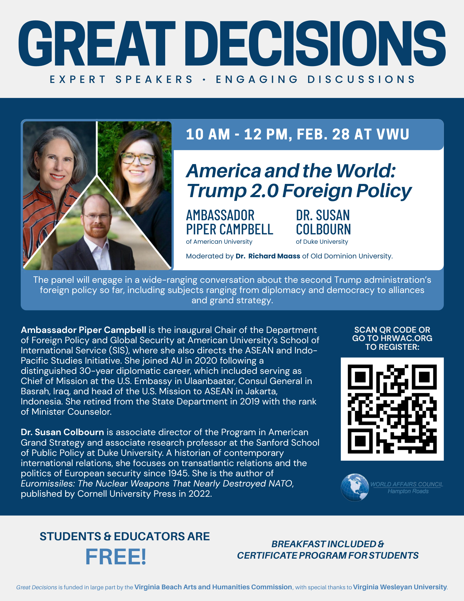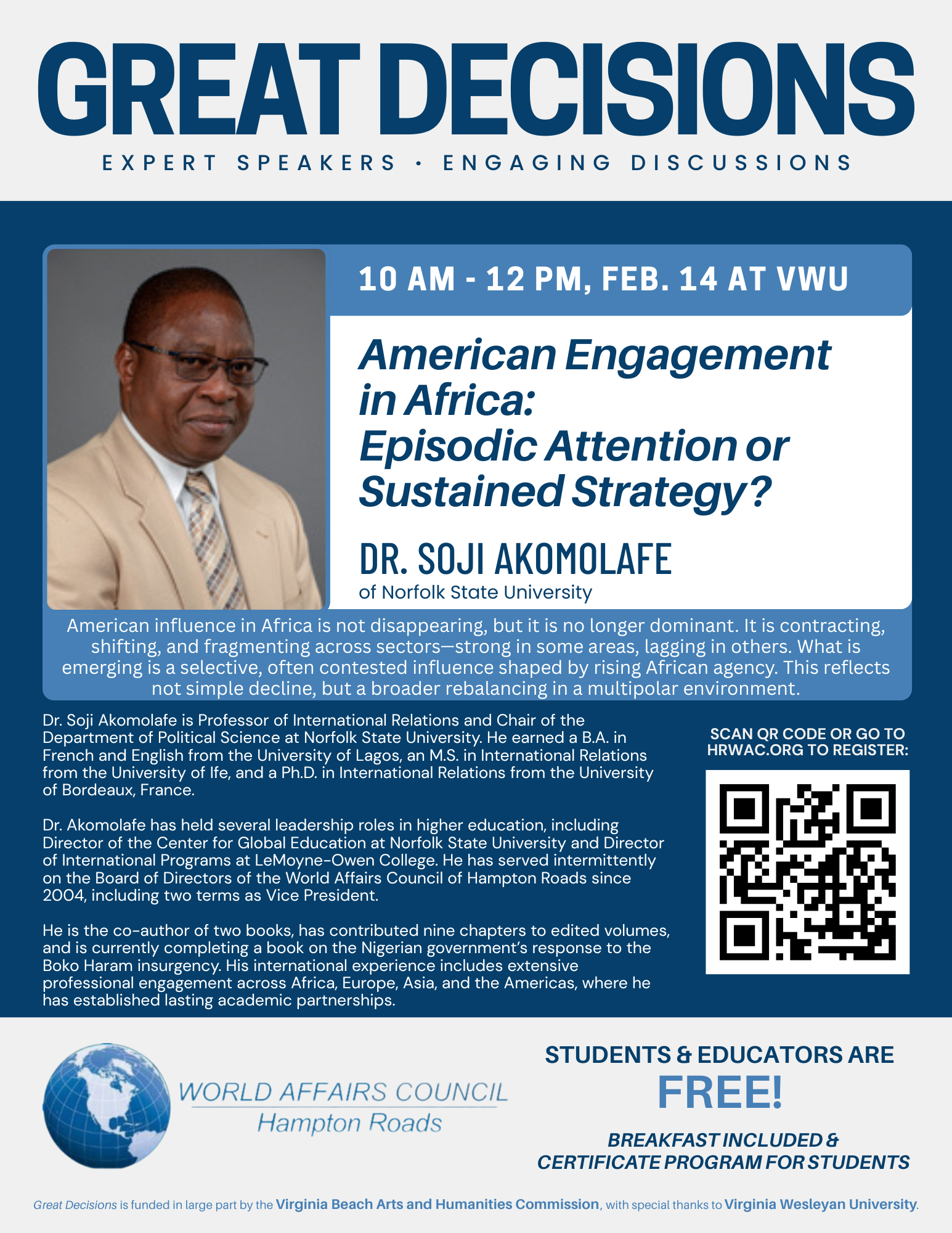 Join us through February at Virginia Wesleyan University for engaging, thought provoking lectures by the experts.